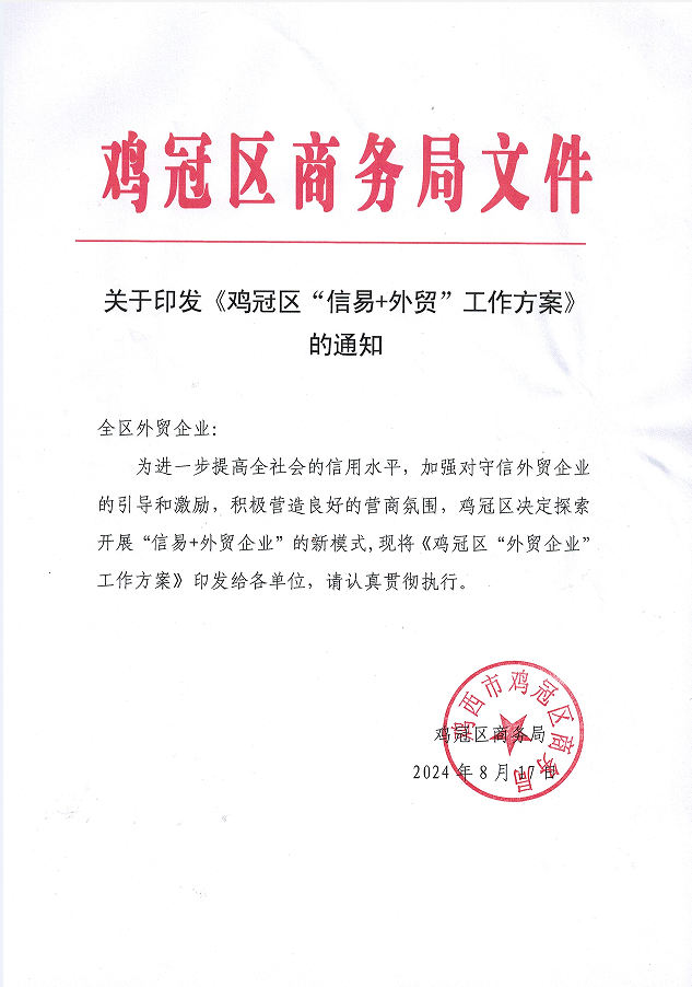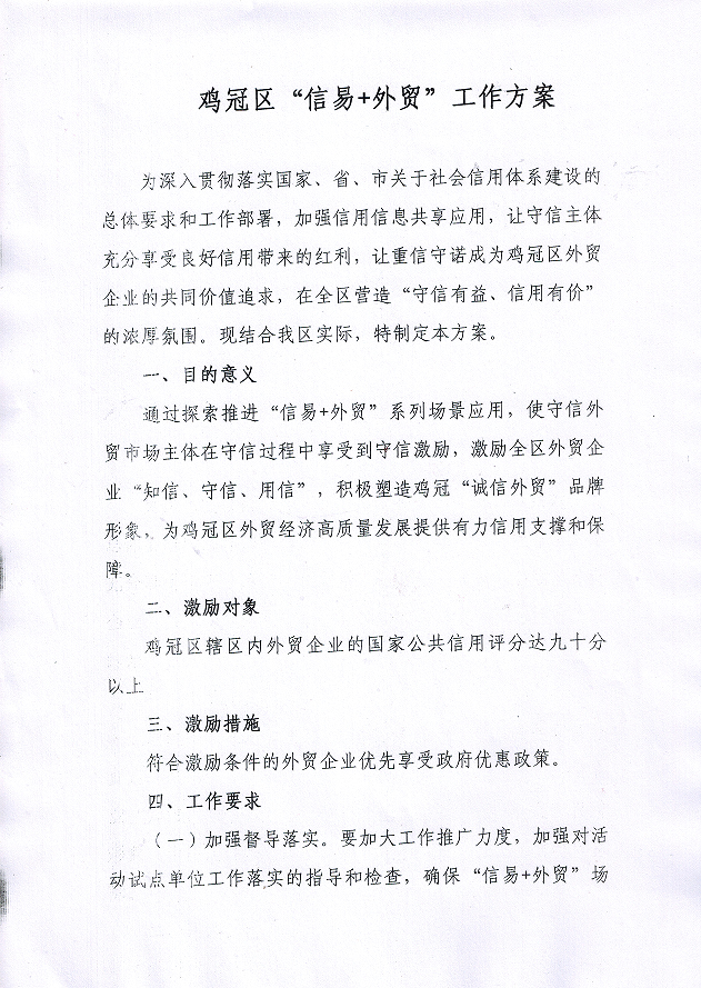 关于印发《鸡冠区“信易+外贸”工作方案》的通知