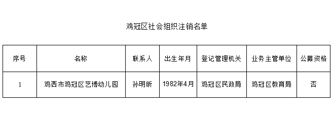 依据《中共中央办公厅、国务院办公厅关于改革社会组织管理制度促进社会组织健康有序发展的意见》相关规定,现对孙明昕同志担任社会组织法定代表人情况予以注销公示。注销公示时间:2025年1月29日--2月4日(五个工作日)。对公示对象如有异议,请于公示期间与鸡冠区民政局联系。 联系电话:0467-2665517
