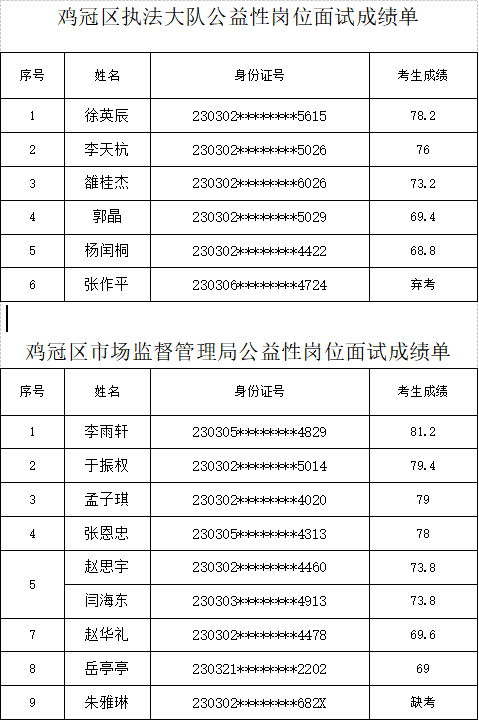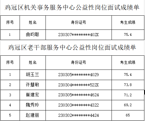 关于鸡冠区公开招聘公益性岗位就业人员面试成绩公示、体检及考察人员的公告