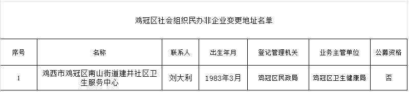 依据《民办非企业单位登记管理暂行条例》、《中共中央办公厅、国务院办公厅关于改革社会组织管理制度促进社会组织健康有序发展的意见》相关规定,现对“鸡西市鸡冠区南山街道建井社区卫生服务中心”地址由和平南大街50号变更为南山路70号。变更公示时间:2026年3月25日--3月31日(五个工作日)。对公示对象如有异议,请于公示期间与鸡冠区民政局联系。 联系电话:0467-2665517