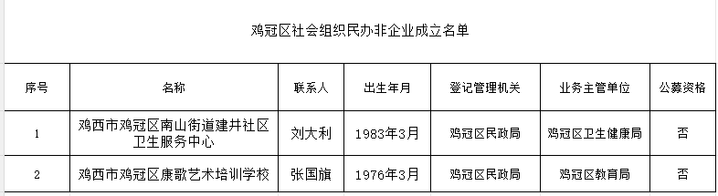 依据《民办非企业单位登记管理暂行条例》、《中共中央办公厅、国务院办公厅关于改革社会组织管理制度促进社会组织健康有序发展的意见》相关规定,现对“鸡西市鸡冠区南山街道建井社区卫生服务中心”、“鸡西市鸡冠区康歌艺术培训学校”公示。公示时间:2026年3月25日--3月31日(五个工作日)。对公示对象如有异议,请于公示期间与鸡冠区民政局联系。 联系电话:0467-2665517