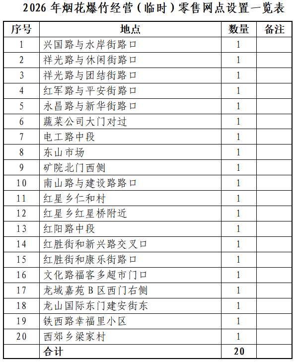 为规范烟花爆竹零售经营秩序,强化安全生产管理,防范安全事故发生,保障人民群众生命财产安全,根据《中华人民共和国安全生产法》与《烟花爆竹安全管理条例》、《烟花爆竹经营许可实施办法》《烟花爆竹零售店(点)安全技术规范》等法律法规和行业标准的相关要求,现将鸡冠区2026年烟花爆竹临时零售网点申请报名工作有关事项公告如下: