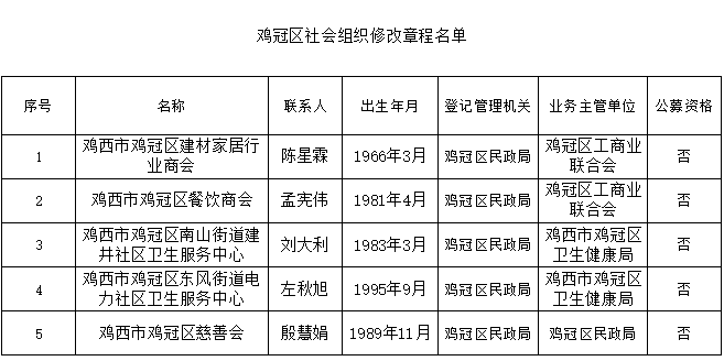 依据《社会团体登记管理条例》、《民办非企业单位登记管理暂行条例》相关规定,现对鸡西市鸡冠区建材家居行业商会、鸡西市鸡冠区餐饮商会、鸡西市鸡冠区南山街道建井社区卫生服务中心、鸡西市鸡冠区东风街道电力社区卫生服务中心、鸡西市鸡冠区慈善会情况予以修改公示。修改公示时间:2025年2月5日--2月11日(五个工作日)。对公示对象如有异议,请于公示期间与鸡冠区民政局联系。 联系电话:0467-2665517